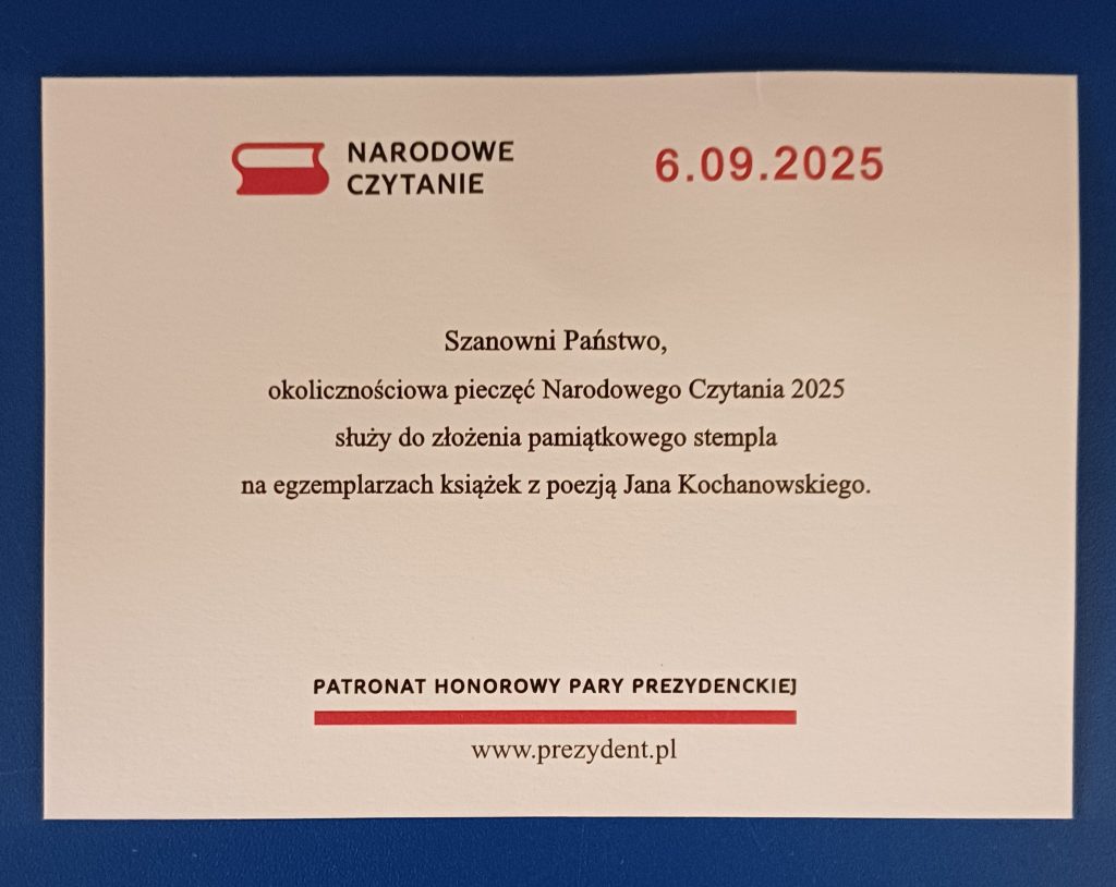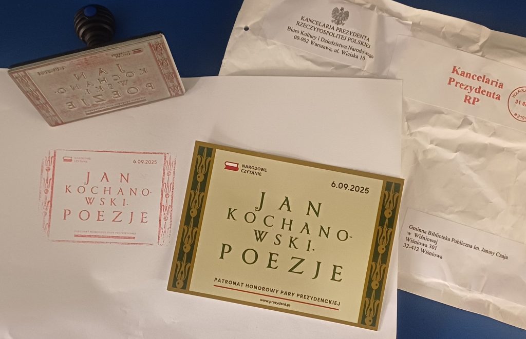 Do naszej biblioteki dotarła już przesyłka z Kancelarii Prezydenta RP, zawierająca pamiątkową pieczęć przygotowaną z okazji tegorocznego Narodowego Czytania.