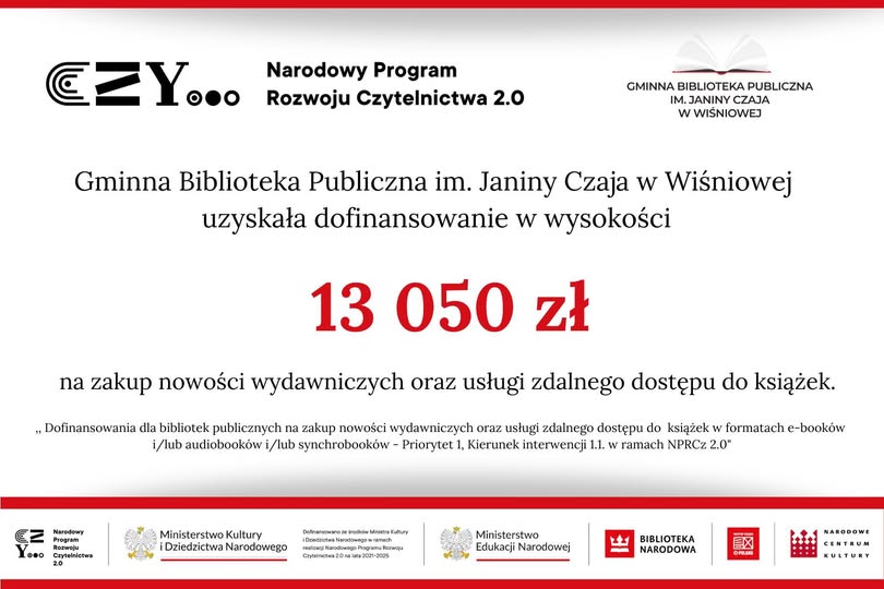 „Dofinansowania dla bibliotek publicznych na zakup nowości wydawniczych oraz usługi zdalnego dostępu do książek w formatach e-booków i/lub audiobooków i/lub synchrobooków – Priorytet 1, Kierunek interwencji 1.1. w ramach NPRCz 2.0.
